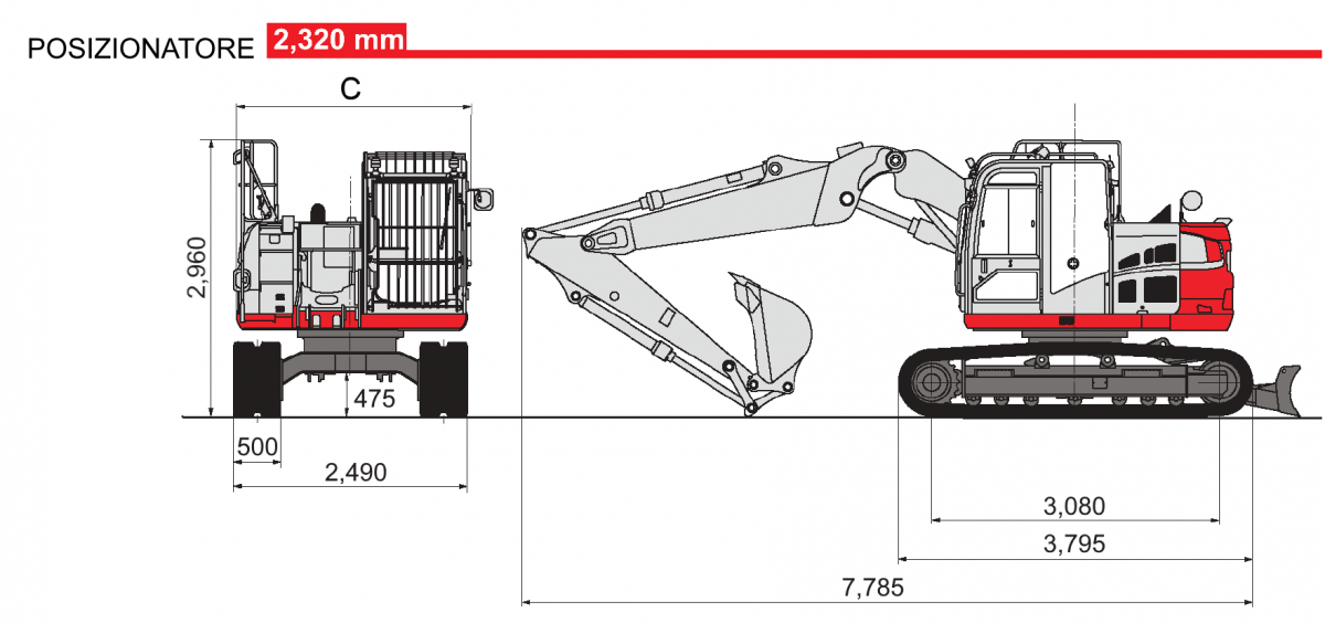 Nonostante le grandi dimensioni, il TB-2150R ha il vantaggio di essere short tail: la lettera “R” (round) indica che lo sbalzo posteriore della macchina rimane all’interno della larghezza massima del carro, con una sporgenza di circa 450 mm.